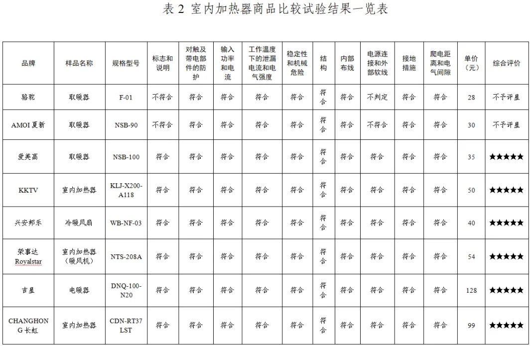 2.2款样品(骆驼牌•☆“取暖器”、AMOI夏新牌“取暖器”)不符合强制性国家标准,不予评星。
