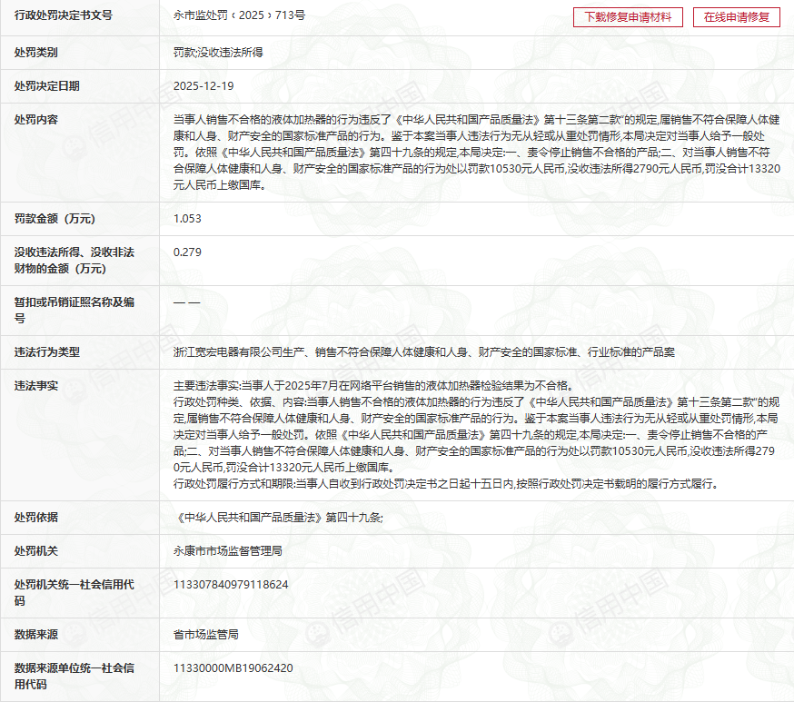 2025年12月19日◁▼★,永康市市场监督管理局作出永市监处罚〔2025〕713号行政处罚决定△,浙江宽宏电器有限公司因生产、销售不符合安全标准的液体加热器★…,被责令停止销售不合格产品★■,同时处以1.053万元罚款、没收违法所得0.279万元=,罚没合计1.332万元▲□。该企业旗下拥有抖音店铺:小壮熊官方旗舰店◇-▽、淘宝店铺▪:小壮熊旗舰店,作为涉事产品的网络销售渠道,此次处罚直指母婴类电器产品的质量安全管控漏洞。