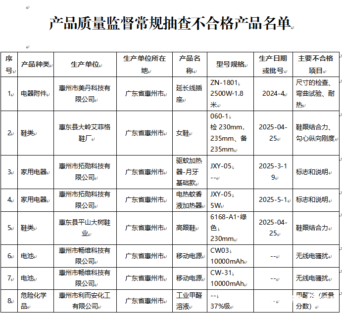 不合格产品主要集中在5类产品中,其中电器附件1批次、鞋类2批次、家用电器2批次、电池2批次、危险化学品1批次,各品类不合格问题各有侧重。家用电器方面,惠州市拓勋科技有限公司的驱蚊加热器、电热蚊香液加热器两款产品,标志和说明项目不达标;电器附件领域,惠州市美丹科技有限公司的延长线插座因尺寸检查、弯曲试验、耐热三项指标不合格;鞋类产品有2批次不合格,惠东县大岭艾菲格鞋厂、惠东县平山大树鞋业的产品分别存在鞋跟结合力、勾心纵向刚度等问题;电池产品中,惠州市畅维科技有限公司的两款10000mAh移动电源均检出无线电骚扰项目不合格;危险化学品方面,惠州市利而安化工有限公司的37%级工业甲醛溶液,甲醛质量分数指标不符合标准要求。